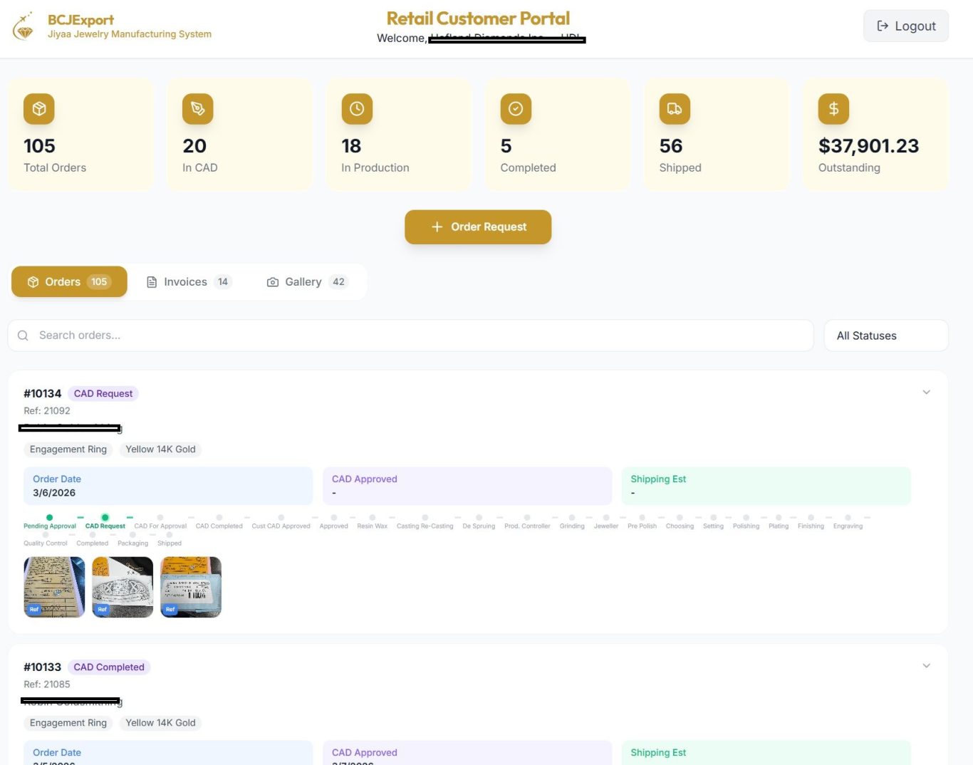 - Order Number (e.g., #10113) with a colored status badge (e.g., "Jeweller", "Approved", "Shipped")